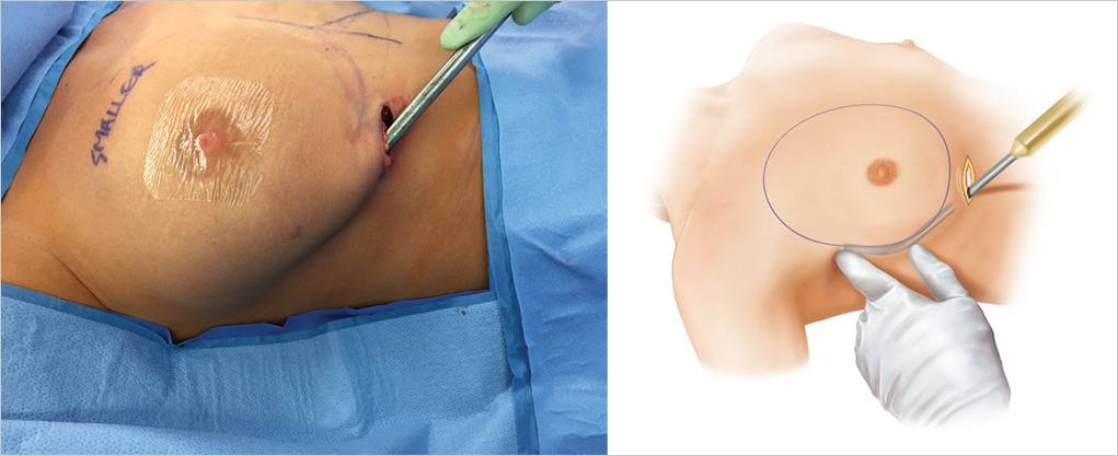 Subpectoral implant placement currently remains the commonest approach to breast augmentation. It is usually accompanied by an inframammary incision. This is largely due to the ease with which the subpectoral plane can be accessed through an inframammary incision, although both transaxillary and periareolar approaches have been used very successfully. Recent data have suggested that both the latter approaches may be associated with slightly higher risks of bacterial contamination from axillary apocrine glands or nipple duct secretion, resulting in slightly higher rates of capsular contracture. The inframammary approach has the added benefit of providing easier access to an established implant pocket when performing breast revision or implant exchange in the future.