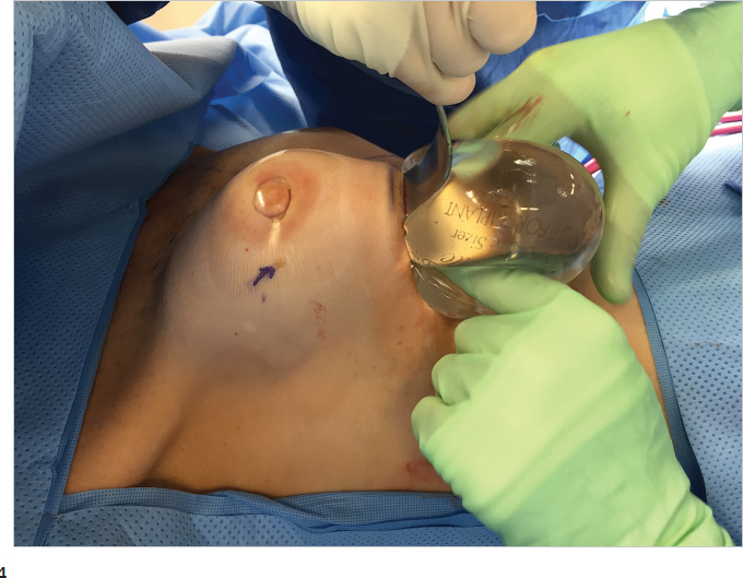 With the pocket size and position established, a temporary breast sizer can be inserted to assess final implant volume. This can be based on a preoperative evaluation of breast measurement with base diameter calculations or it can be influenced by the use of three-dimensional preoperative breast imaging. I personally find the latter approach more satisfying as it gives the patient the opportunity to see her potential breast volume in real time. The mathematical algorithms associated with current three-dimensional imaging software are so sophisticated now that they provide an extremely good estimate of breast aesthetics. Since we have been using three-dimensional imaging, we find far fewer patients expressing regret at 6 months that their breasts are too small compared with what they would have liked. Mathematical formulae associated with breast base width assessment commits a patient to a particular volume, which may be far lower than what she actually desires from an aesthetic standpoint (▶Fig. 15.7).