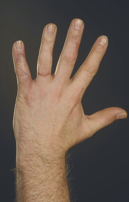 On the recipient site, debridement on the dorsum of the left little finger revealed a tissue defect of 4 × 1.5 cm along with 2.5-cm gap of the central slip of the extensor tendon. The radial digital artery and a dorsal superficial vein over the head of the fifth metacarpal were prepared for anastomosis. 11.0 nylon was used for microsurgical anastomosis. The patient had an excellent outcome (Fig. 16‑4, Fig. 16‑5, Fig. 16‑6).