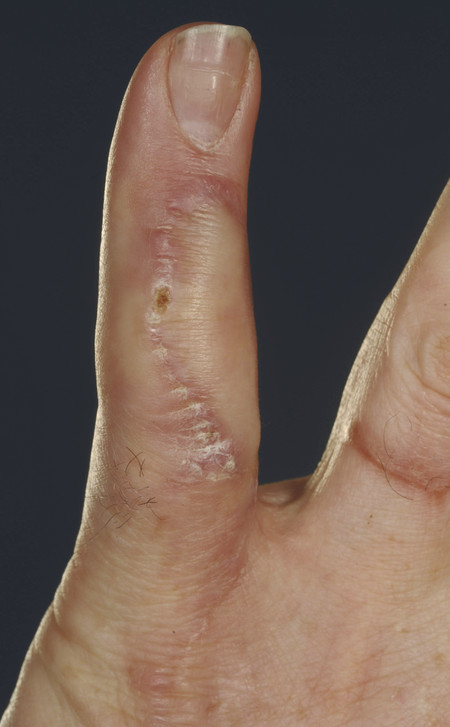 Fig. 16.1 Defect over extensor zone 2 of the little finger with segmental tendon loss and bone exposure 4 × 1.5 cm defect.