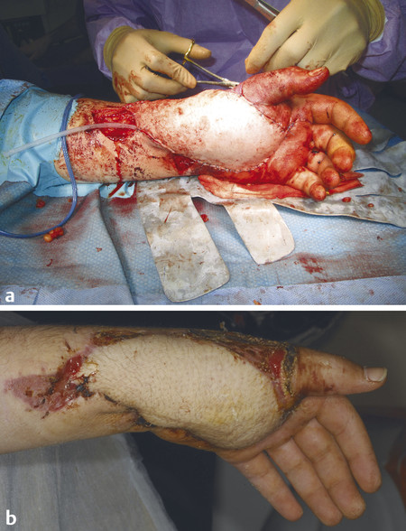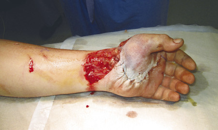 Fig. 16.7 Crush injury to left hand with necrotic tissues beneath degloved skin.