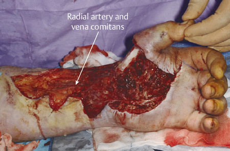 Fig. 16.8 Post meticulous debridement, a large defect with exposed first metacarpal is demonstrated. The radial artery and vena comitans are prepared as recipient vessels.