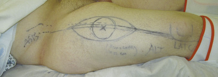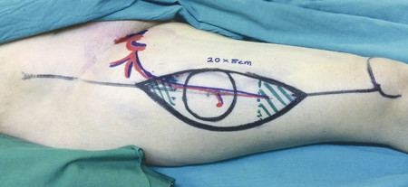 Fig. 16.12 Color markings of ALT flap demonstrating descending branch of LCFA. LCFA, lateral circumflex femoral artery.