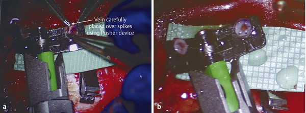 Fig. 16.11 (a,b) Veins anastomosed with venous coupler.