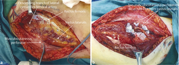 Fig. 16.13 (a,b) ALT flap dissection. Pedicle identified between rectus femoris and vastus lateralis. In this case, two musculocutaneous perforators have been dissected free from the vastus lateralis.