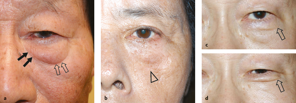 Orbicularis oculi prominence also contributes to lower eyelid aging features, with static and dynamic wrinkles. Horizontal or oblique lines accentuated with facial expressions can be noticed in many patients, and may be more common in Asian patients (Fig. 16.1c,d ).13,24