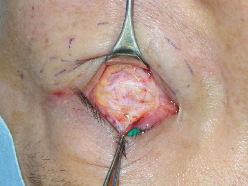 A preseptal transconjunctival lower blepharoplasty is also performed by some surgeons: a conjunctival incision is made below the tarsus, dissection then proceeds inferiorly, and a preseptal space is assessed. The orbital septum is opened to expose the orbital fat. Proponents of the preseptal approach suggest that the scar formation on the septum may bolster against the pseudo-herniation postoperatively. No significant difference in eyelid position between preand retro-septal approaches has been reported.27,28