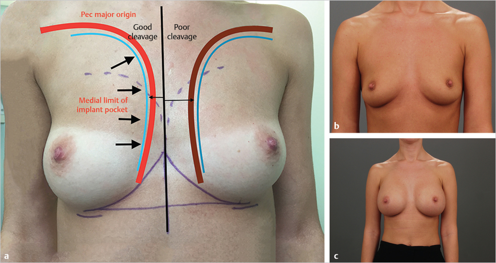 Fig. 16.1 (a) The impact of pectoralis major origin on medial implant placement and cleavage formation. (b) A young woman with widely spaced breasts and poor cleavage formation seeking submuscular breast augmentation. (c) The impact of submuscular augmentation in this patient resulting in wide separation of the augmentation and poor cleavage development.