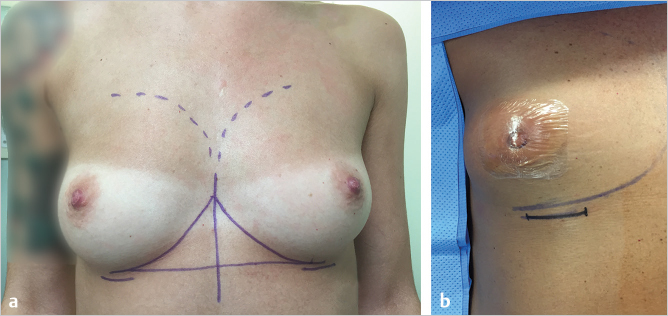 Fig. 16.2 (a) Preoperative marking of the patient for subfascial augmentation. (b) The patient is in the supine position and the nipple covered with an occlusive dressing prior to incision.