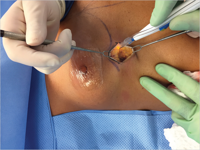 Fig. 16.3 The inframammary incision performed with electrocautery dissection usually with autologous procedure passing upward through Scarpa’s fascia.