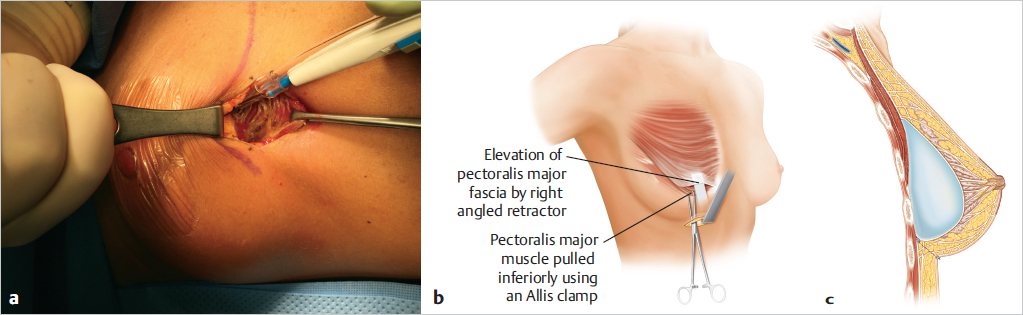 Fig. 16.4 (a,b) Development of the subfascial plane showing the pectoralis major fascia elevated with a right-angled retractor and the pectoralis major muscle pulled inferiorly with an Allis clamp. (c) Diagrammatic illustration of subfascial plane of dissection.
