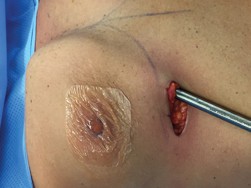 The patient is placed on the operating table in the supine with careful Paddington or pressure points. The arms are abducted on arm boards with soft padding to prevent nerve compression. The arms should not be abducted greater than 90 degrees. The nipple is covered with an occlusive dressing such as Tegaderm or Opsite (▶Fig. 16.2b).