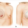 The patient is marked in the erect position with arms relaxed at her sides. The midline is marked and the medial extent of the dissection is carefully outlined so as not to run the risk of creating synmastia. The upper limit of pocket to section should be assessed and should not rise above the uppermost level of the anterior axillary fold. The inframammary crease is marked to ensure symmetric levels of the inframammary fold and the incision is placed either at or just below the inframammary crease as discussed earlier (▶Fig. 16.2a).