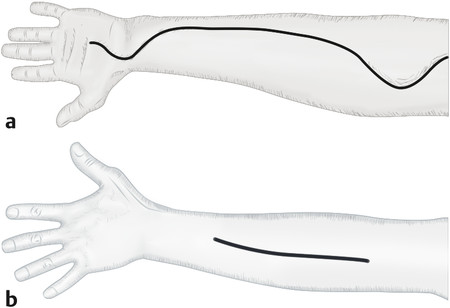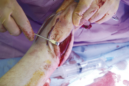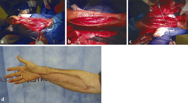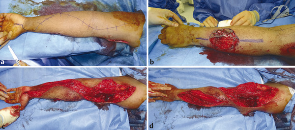Surgery involves a long curvilinear incision over the flexor forearm and a straight line incision over dorsal extensor compartment. The carpal tunnel is first released, a U-shaped flap is placed over the wrist and this is to protect the median nerve from exposure. The incision should release the deep and superficial compartments of the arm. The flexor pollicis longus (FPL) compartment is often the most affected. The mobile wad (brachioradialis, extensor carpi radialis brevis [ECRB], and extensor carpi radialis longus [ECRL]) should also be released. Once the patient is stabilized, the wound can be skin grafted with vacuum-assisted closure (VAC). If caught in time, patients can make a full recovery with good long-term outcome (Fig. 17‑1, Fig. 17‑2, Fig. 17‑3).