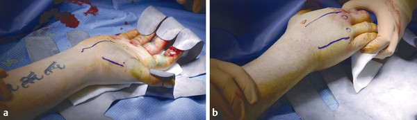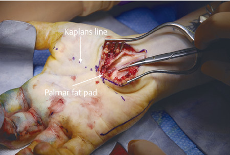 The compartments include hypothenar, thenar, adductor pollicis, the four dorsal interosseous muscles, and three volar interosseous muscles. The carpal tunnel must also be released (Fig. 17‑4, Fig. 17‑5, Fig. 17‑6, Fig. 17‑7, Fig. 17‑8, Fig. 17‑9).