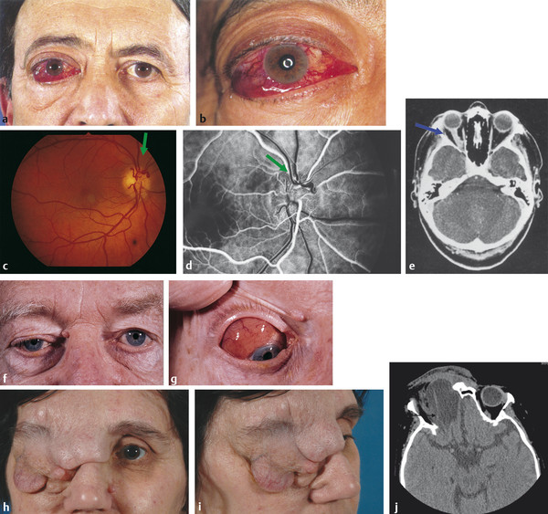 The patient should undergo a full ocular examination, a specific orbital examination, and, where indicated, a full general physical examination. A careful examination of the globe and ocular adnexa may provide important clues to the underlying diagnosis; for example, dilated episcleral vessels may suggest an arteriovenous shunt (Fig. 18‑2a,b); opticociliary shunt vessels may suggest an optic nerve sheath meningioma (Fig. 18‑2c–e); a “salmon patch” lesion beneath the upper eyelid may indicate the presence of an orbital lymphoma (Fig. 18‑2f,g), although such a lesion can also be seen in amyloidosis, sarcoidosis, leukemia, lymphoid hyperplasia, and rhabdomyosarcoma; eversion of the upper eyelid may reveal a waxy yellow infiltrate with tortuous vessels suggesting an amyloid lesion; an S-shaped deformity of upper eyelid may suggest a plexiform neurofibroma (Fig. 18‑2h–j).