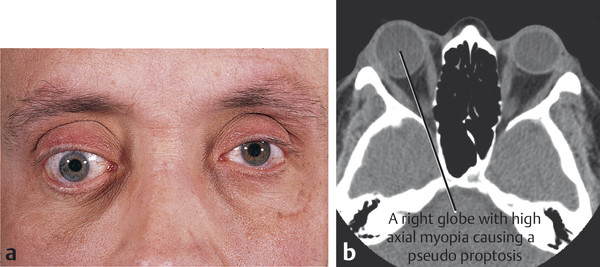 Proptosis or enophthalmos should be assessed and measured using an exophthalmometer. As a general rule, any asymmetry greater than 2 mm is considered pathological. Pseudoproptosis (unilateral and bilateral) from high myopia, contralateral enophthalmos, or facial asymmetry should be excluded (Fig. 18‑3).