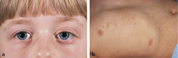 The patient’s skin and oropharynx should be assessed. The presence of cutaneous or intraoral vascular lesions may suggest an orbital lymphangioma. The presence of cafe au lait spots suggests neurofibromatosis (Fig. 18‑8).