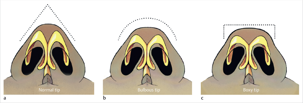 Fig. 18.1 (a–c) Morphology of normal, bulbous, and boxy tips. (Reproduced with permission from Rohrich R, Adams W, Ahmad J, et al, eds. Dallas Rhinoplasty: Nasal Surgery by the Masters. 3rd ed. Thieme; 2014.)