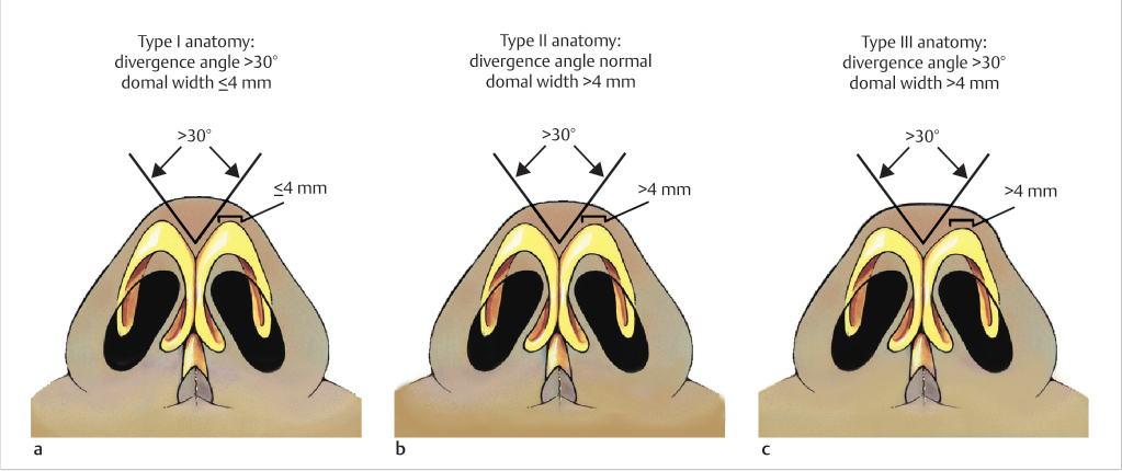 Fig. 18.2 (a–c) Classification of boxy tip based on domal arch width and interdomal angle of divergence. (Reproduced with permission from Rohrich R, Adams W, Ahmad J, et al, eds. Dallas Rhinoplasty: Nasal Surgery by the Masters. 3rd ed. Thieme; 2014.)