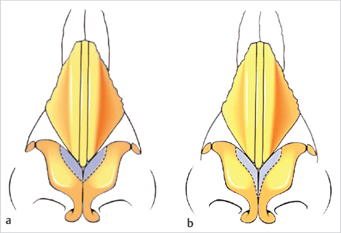 Fig. 18.3 Incremental approach to cephalic trim. (a) Shows limited cephalic trim. (b) Shows middle and lateral crural cephalic trim. (Reproduced with permission from Rohrich R, Ahmad J, eds. The Dallas Rhinoplasty and Dallas Cosmetic Surgery Dissection Guide. 1st ed. Thieme, 2018.)