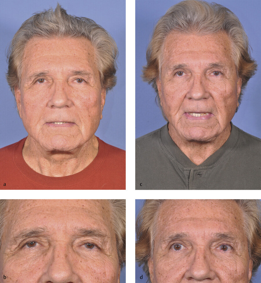 The preoperative recognition of a ptotic brow is essential for a satisfactory upper blepharoplasty result. The patient may require a brow lift instead of, or in addition to, an upper blepharoplasty procedure. It is observed that when the upper eyelid skin is removed, the distance between the eyebrow and the eyelid margin is shortened. Consequently, an uncorrected brow ptosis may be more noticeable after surgery, resulting in a seemingly less effective blepharoplasty. 3 Therefore, when brow ptosis is noted, patients should be advised on procedures available to reposition the eyebrow prior to or at the same time as an upper blepharoplasty (Fig. 19.1).