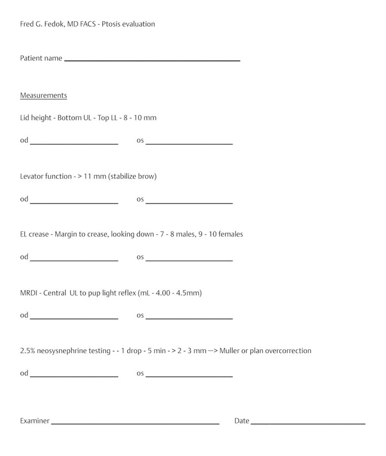 A thorough preoperative patient evaluation is an important first step to limit the risk of postoperative complications. For example, systemic diseases such as thyroid disease should be investigated as it can affect eyelid position and eyelid edema. 2 In addition, ocular, facial, and skin abnormalities such as dry eyes, narrow chamber angles, facial nerve dysfunction, blepharitis, eczema, rosacea, blepharospasm, and visual acuity/visual field are among the issues that should be noted and documented.