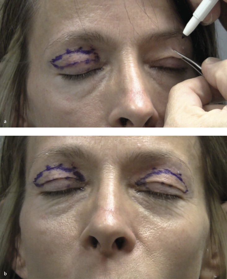 In marking the skin, one must verify that eye closure will be complete with the amount of skin excised, and hence, there should be a certain conservatism during the planned marking of the skin (Fig. 19.4). The excess eyelid skin is grasped with smooth forceps. The tines of the forceps are adjusted to approximate the amount of skin to be removed while maintaining the lower tine of the forceps on the planned inferior incision and gently pinching the skin. This is repeated at several positions along the eyelid to determine some of the points for the placement of the upper eyelid incision. 7 While holding the excess skin between the forceps’ tines, the eyelid should be observed to still be able to be closed. The incisions should be planned to be limited to the thinner upper eyelid skin and to not extend into the thicker infrabrow skin. Often the thinner eyelid skin that can be removed has a different color and texture than the surrounding skin. The position of the brow should also be noted and should not be disturbed by this process. The amount of skin between these superior and inferior incisions varies between patients. Even in the same patient it can vary between the left and right eyes. It is important to avoid excess skin excision as this can cause lagophthalmos and problems with dryness. Note that when the eyes are closed, there should be complete closure of the eyelids. The lateral aspect of the incision should be designed along a diagonal (parallel to the crow’s feet) so that lateral hooding is reduced during skin excision.