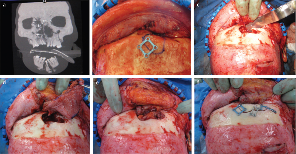 Exploration, sinus mucosa removal, closure of the NFD, and obliteration of the frontal sinus presents specific challenges. When sinus mucosa removal is indicated, removal of the entirety of the anterior table is indicated. A forceps can be placed into the sinus to define the boundaries of the sinus which are subsequently marked. The anterior table is indexed with fixation, the plates are removed, and the bone is subsequently osteotomized. The anterior table is then elevated and removed. All sinus mucosa and septae should be removed with diamond burs. Placement of methylene blue in the sinus prior to mucosa removal may help in preventing missed areas of sinus mucosa (Fig. 19‑1).