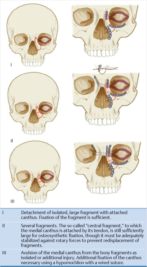 The medial canthal tendon (MCT) divides into anterior and posterior limbs which attach anteriorly along the anterior lacrimal crest and posteriorly along the posterior lacrimal crest. The MCT envelopes the lacrimal sac. The classification developed by Markowitz et al evaluated the MCT attachment and degree of comminution of the NOE fragment. 9 In type 1 fractures, the MCT remains attached to a large bony segment (central fragment) without comminution. In type 2 fractures, the NOE segment is comminuted with the MCT remaining attached to the central fragment. In type 3 fractures, there is comminution of the NOE segment with detachment of the MCT. A type 1 fracture is typically discernable from a type 2 or 3 fracture radiographically. MCT avulsion is generally determined intraoperatively making preoperative diagnosis of a type 2 versus type 3 fracture difficult (Fig. 19‑2).