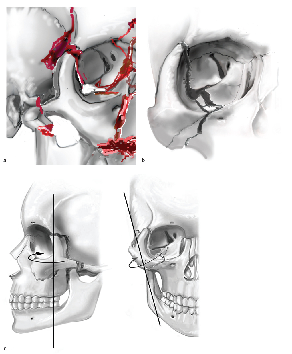 Rotation of the ZMC, in addition to displacement, creates challenges to ensure appropriate reduction. Axial rotation of the complex around any articulation may demonstrate adequate reduction at an isolated articulation, while globally the ZMC is still significantly displaced. The zygomaticosphenoid suture (ZSS) is the longest line of fracture and provides the most reliable indication of adequate reduction. The frontozygomatic suture does not reliably demonstrate adequate reduction of the ZMC due to ease of rotation of the complex around one point. Open evaluation of at least 3 points of articulation is typically recommended in significantly displaced medium and all high-energy fractures. Utilization of a Carroll-Girard screw or a Rowe elevator can be useful in mobilization of the ZMC.