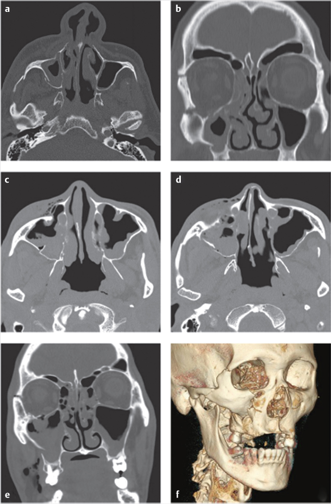 Advancements in endoscopic sinus surgery have generated interest in treatment of anterior table fractures with NFD injury. Anterior table repair without obliteration with antibiotic administration and serial computed tomography is advocated by some authors. 8 NFD patency may spontaneously occur after repair of the anterior table in a majority of patients, with select patients requiring secondary endoscopic sinus surgery for NFD outflow obstruction. Expert consultation with an otolaryngologist may be warranted in select cases.
