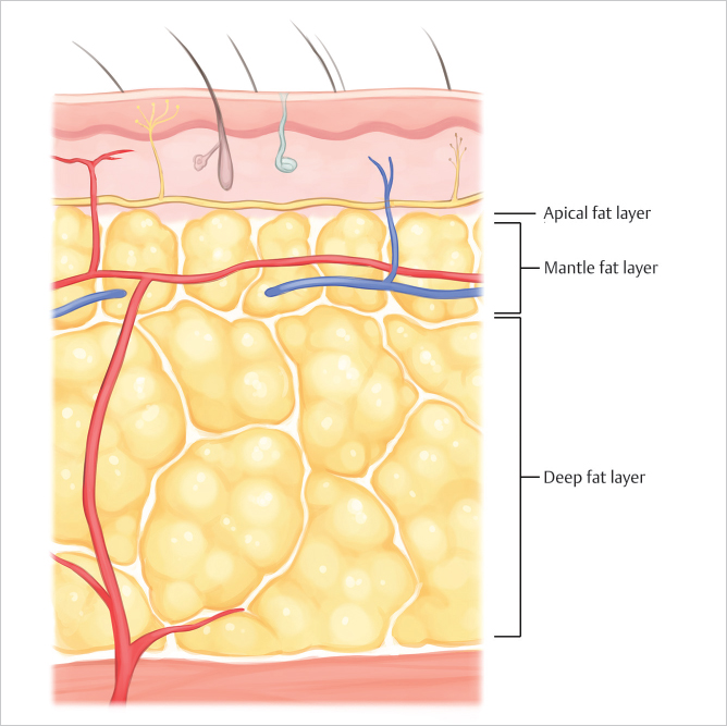 The apical layer is most superficial, located just beneath the reticular dermis, containing yellow-appearing fat and fibrous septa running perpendicular to the skin. Other structures are present including sweat glands, hair follicles, and vascular and lymphatic channels. All these structures are susceptible to damage by the liposuction cannula if this layer is not carefully avoided (▶Fig. 2.1). Traumatic injuries were more common when larger diameter cannulas were used (8–10 mm) with sequelae including seromas, hyperpigmentation, and even skin necrosis. These complications are rare in today’s era of 2–3 mm cannulas. 3 , 4