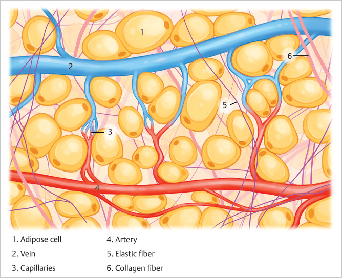 Adipocytes in subcutaneous fat are arranged into lobules supported by septa, a stroma of loose connective tissue, containing a dense capillary network. A high osmotic pressure gradient forces the cells into a tightly packed configuration within the lobule, each supported by a web of collagen fibers known as the extracellular matrix (ECM). The ECM, contiguous with the interlobular septa, connects each cell to the capillary network and also acts as a substrate for cell growth and proliferation. 4 , 7 , 9 This high capillary density, along with low O2 demands, gives adipose has the highest partial oxygen tension of all organs. 10 The characteristic arrangement of adipose (cells compacted within rich microvasculature) and the high sensitivity of these capillaries to epinephrine allows for effective use of tumescent anesthesia and makes office-based liposuction a safe and bloodless operation. 4
