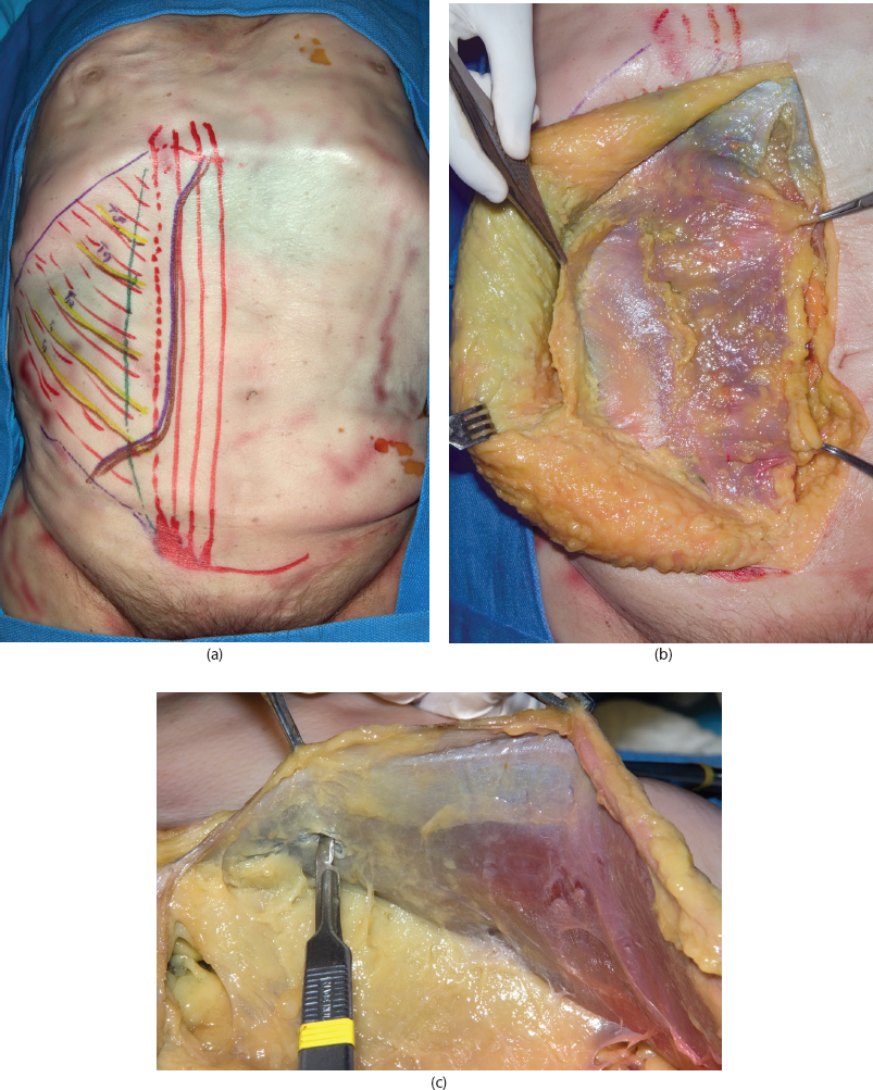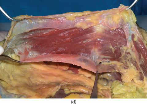 Figure 2.1 Cadaver dissection. (a) The rectus abdominis muscle, inferior margin of the ribs, anterior superior iliac spine, inguinal ligament, and external oblique muscles are marked. (b) Skin and subcutaneous tissue elevated off the abdominal wall fascia; an incision is made in the external oblique fascia lateral to the semilunar line, and the external oblique is separated from the internal oblique laterally to the midaxillary line. (c) Posterior rectus sheath release 2 cm lateral to the medial edge of the rectus muscle. (d) Posterior rectus sheath dissected free from the rectus muscle.
