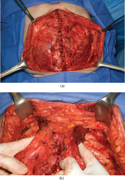 Figure 2.2 (a) Release of the external oblique muscle is completed bilaterally, and the midline is closed. (b) To move the upper rectus muscles medially, the external oblique fascia is released over the level of the ribs, and the superior aspects of the muscles are mobilized and moved medially (different patient than in Figure 2.2a).