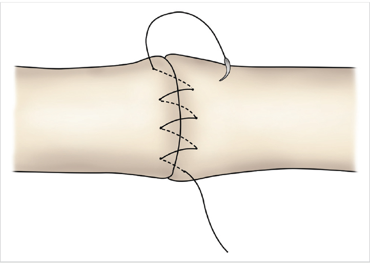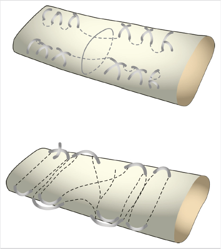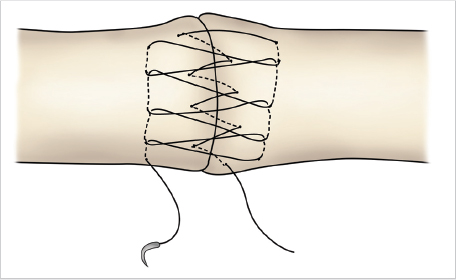 Repair techniques include modified Becker, modified Bunnell (► Fig. 2.2), modified Kessler, or running, interlocking, horizontal mattress (RITM) stitch as described by Lee et al 1 (► Fig. 2.3 and ► Fig. 2.4). The augmented or modified Becker suture method was performed with two rows of laterally placed crisscrossing sutures initiated 1 cm from the edge of the tendon with three crosses for each side of the tendon margin. The modified Bunnell suture method consists of four core sutures with the second core suture placed next to the first as described by Howard et al. 2 For the RITM suture configuration, a simple running suture is placed followed by a mattress configuration that is locked by passing the suture needle underneath the preceding crossing suture. Woo et al 3 reported four different extension repair techniques comparing modified Kessler, modified Becker, figure of 8, and double loop technique. They found that the modified Becker technique failed solely by suture breakage instead of pull out, with the highest resistance to gapping. They suggested that sutures applied to the lateral edge of the extensor tendon perpendicular to the orientation of the fibers provided the strongest repair, especially for zone 2 and 4 injuries. In addition, with the modified Becker technique the crisscross lattice creates a finger trap effect around the tendon to strengthen the repair. 3 Chung et al 4 performed a biomechanical study investigating the strength of 1, 2, or 3 cross-stitches using the modified Becker technique and found that a single cross-stitch had increased stiffness, yield load, and less gap formation than multiple cross-stitches. However, a single cross-stitch had a lower ultimate load to failure compared with three cross stitches. The tendon distal to the MCP joint (zones 2–4) are generally thinner and best repaired with RITM technique using 4–0 nonabsorbable braided sutures, whereas the tendon proximal to zone 5 can accommodate a core suture better and can be better secured with a modified Kessler or modified Becker stitch using 3–0 nonabsorbable braided sutures.