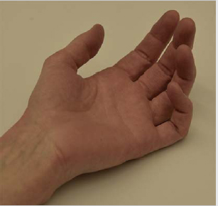 • Ring and small fingers have hyperextended MP and flexed PIP and distal inter-phalangeal (DIP).