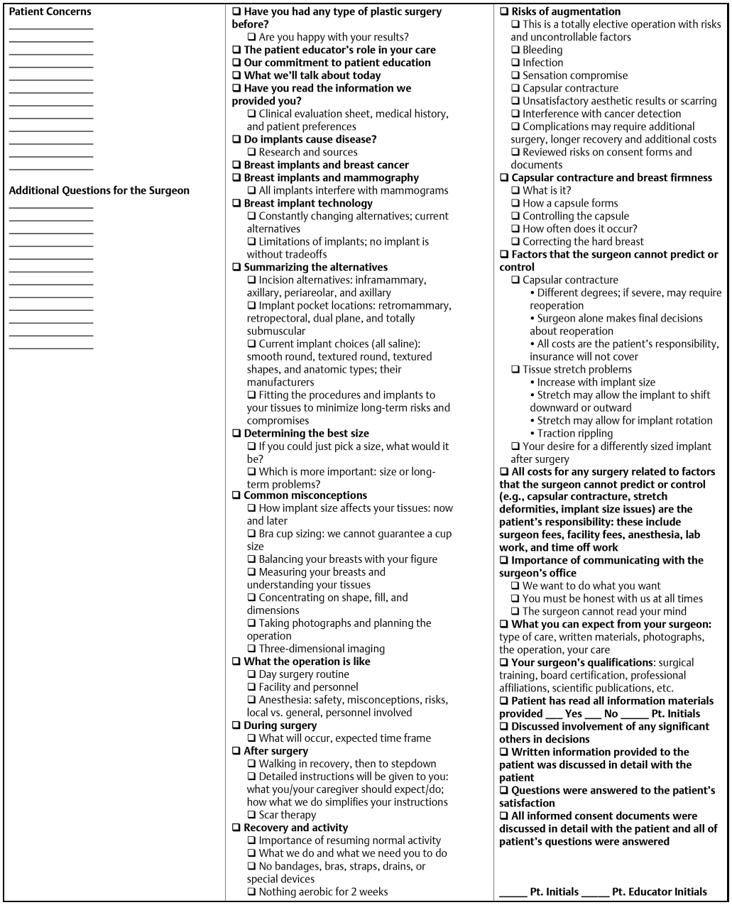 In the last 10 years, the value of a truly educated patient in breast augmentation has been proven and realized. Although many have understood the importance of this concept, few have developed any reproducible work flow to deliver this in a practice to all patients. In 2002, Tebbetts and Tebbetts reported, in a sentinel publication, a stringent methodology to ensure a fully educated and informed patient. 1 Prior to this, surgeons used nonuniform verbal methods and a written surgical disclosure/informed consent to accomplish the educational objectives, often falling short of fully educating the patient. The We had used similar less reproducible methods until after 2002 when a specific set of breast augmentation education/informed consent documents were customized based on the original manuscript. 1 Patients were required to complete the documents (Appendix) prior to their educational consult, which was accomplished either over the phone or in person, lasted on average 30 minutes (down from 45 to 60 minutes 5 years ago), and was performed by a patient education specialist. During the educational consult, all concepts, issues, and limitations are directly addressed and reviewed with the patient (Fig. 2‑1). The checklist shown in Fig. 2‑1 is a general guide. This chapter will serve to clarify the main goals of the education consult for the reader.