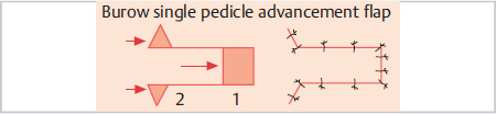 Simple pedicled advancement flaps involve the dissection of cutaneous flaps that can be advanced into the defect parallel to their axis. The dimpling of the skin that occurs at the base of the flap, as it is advanced, can be compensated for by excising what are known as the Burow triangles at the base of the flap (▶Fig. 2.1). With the bipedicled advancement flap, also known as a bridge flap, the advancement is 90 degrees to the axis of the flap. Here, additional measures, such as skin grafting, may be required to cover the donor site defect.
