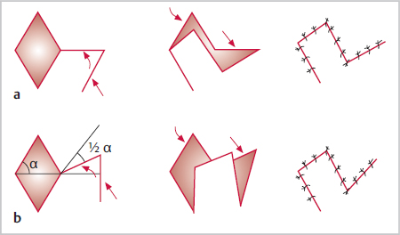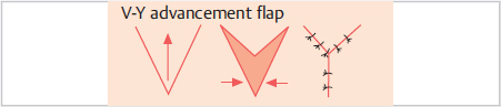 The principle of the V-Y advancement flap (▶Fig. 2.2) is a gain in length at the expense of width. A V-shaped cutaneous flap with equal limbs is raised, mobilized, and approximated to the shape of a Y. The axis of the V-shaped flap must correspond to the axis of the advancement. A Y-V flap is the opposite. Here width is gained at the expense of length. After a Y-shaped incision is made, the central triangular tissue flap is approximated to the end of the vertical incision, forming a V.