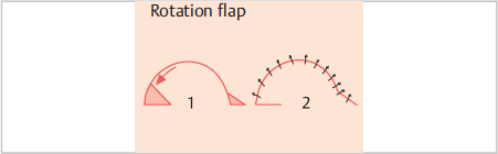 Rotation flaps are based on a defined axis of rotation around which the arc-like flap is swung into the adjoining defect. This requires integrating the respective existing defect into a triangular arc along the semicircular incision made to raise the rotation flap. This incision must be at least 5 times as long as the necessary advancement. The choice of the arc and the course of the incision should be determined by the available tissue and its vascular supply (▶Fig. 2.3).
