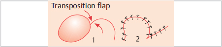 With the transposition flap (▶Fig. 2.4), the axial cutaneous flap can be raised without regard to the defect to be covered and then rotated into the defect. Double transposition flaps involve a combination of two transposition flaps. The portion close to the defect is used to cover the defect, whereas the somewhat smaller portion farther away is used to cover the gap created by the closer portion as it is advanced into the defect. Such flaps are used particularly in cases in which the donor site of the first flap cannot be closed without tension simply by approximating the edges of the wound.
