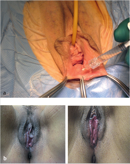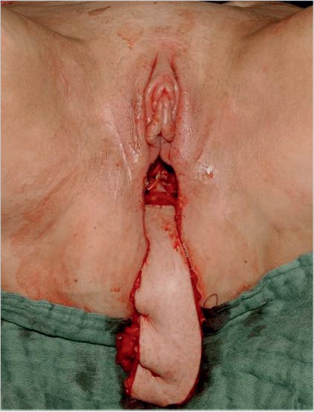 Full-thickness skin grafts are autologous skin grafts that include the dermis and epidermis. The range of applications for full-thickness skin grafts in the external genital region may be regarded as rather limited. They are more often used for the reconstruction of defects in the vaginal wall or in cases of vaginal aplasia. Donor sites include the lower abdominal and inguinal region, both medial thighs, and the scrotum. Whenever possible, the dimensions of the full-thickness skin graft should be such that they allow primary closure of the donor site. When the graft is harvested, all subcutaneous fatty tissue must be carefully removed. Hemostasis must be obtained in the wound prior to placing the graft to ensure that it will be properly integrated. Once the graft has been fixed, it is recommended to apply an elastic compression bandage for 3 to 5 days.