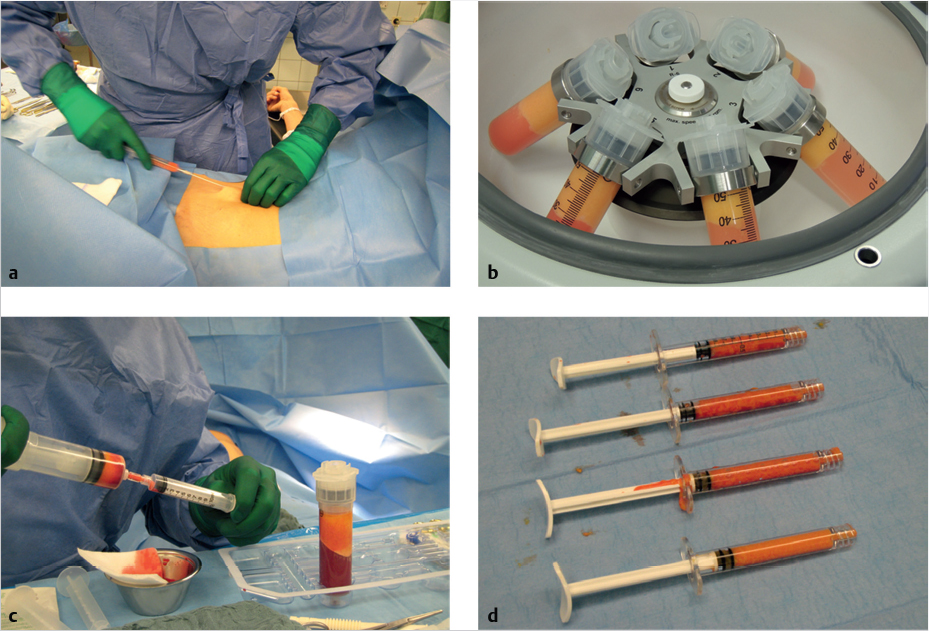 In the hospital, fatty tissue is usually removed under tumescent anesthesia. Different tumescent solutions are used here, but their basic ingredients include a 0.9% saline solution, a vasoconstrictor (such as epinephrine), a local anesthetic, and, in applicable cases, sodium bicarbonate. The solution can be adapted to different needs by varying the component substances. After introducing the tumescent solution into the donor site and waiting for an appropriate interval for the medication to take effect, the surgeon begins with the actual liposuction. This should be done with particular care, using constant low-intensity suction (− 0.5 bar) and a suction cannula with a diameter < 3 mm. Various systems are available for processing the harvested fatty tissue for further transplantation. All of them seek to optimize the quality of the aspirate in order to ensure a high rate of integration into the target tissue. After processing, the fatty tissue is injected through atraumatic needles into the target tissue, wherever possible in several layers, and distributed in a fan-shaped pattern (▶Fig. 2.9). The transplanted material can then be gently massaged into the tissue. Compression therapy of the donor site for 4 to 6 weeks postoperatively is recommended.
