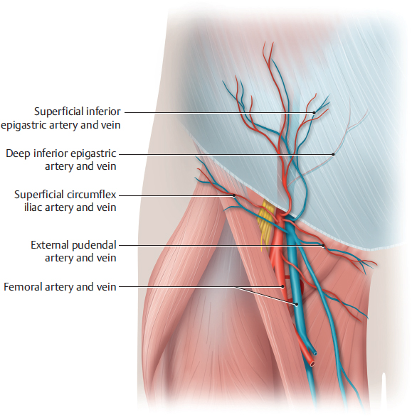 Flaps from the region of the mons pubis and the suprapubic abdomen receive their vascular supply via the superficial external pudendal artery (SEPA) and the SIEA. The SEPA arises from the common femoral artery, passes through the fascia below the inguinal ligament, and branches into the subcutaneous tissue of the lower abdomen and anterior perineum. Their terminal branches anastomose in the lower abdomen with the contralateral SEPA and the terminal branches of the superficial epigastric artery, and in the anterior perineum with those of the superficial and deep perineal arteries. The SIEA also arises from the femoral artery below the inguinal ligament, but after passing through the fascia it courses above the inguinal ligament and continues superiorly within the abdominal fascia.