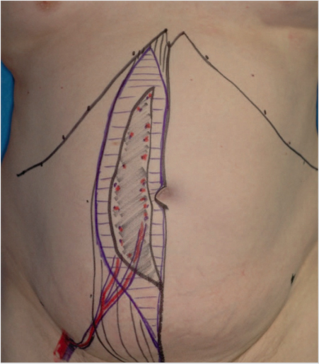 Like the rectus abdominis flap, the DIEP flap can be raised with a horizontal or vertical skin island. The greater portion of the future flap should lie within the area supplied by the selected perforator. The size and shape of the skin island should be adapted to individual patient.