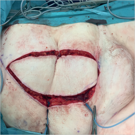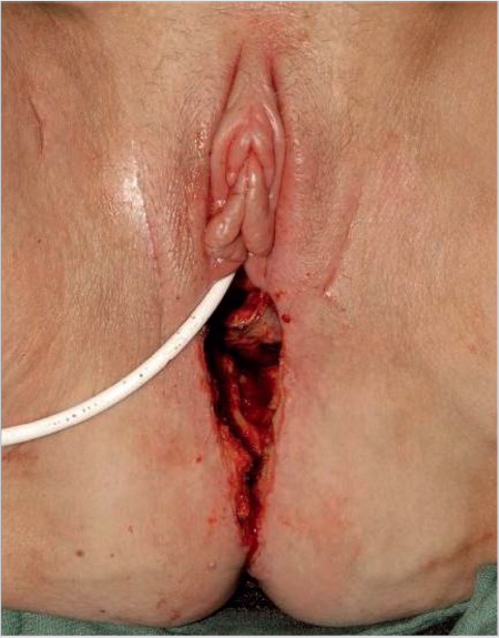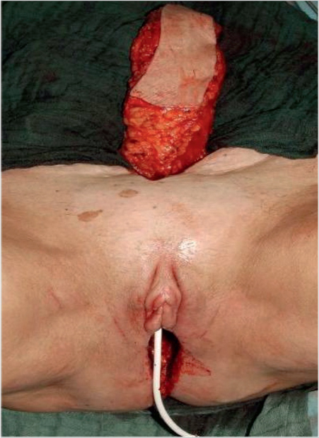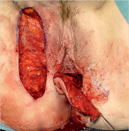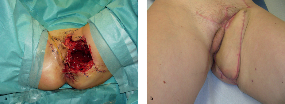 For covering defects in the vulvoperineal region, the rectus abdominis can either be used as a muscle flap, in applicable cases in combination with a split-thickness skin graft, or as a myocutaneous flap. The decision in each case is based on the size of the defect and the thickness of the subcutaneous fatty tissue. In cases where the subcutaneous tissue is quite pronounced and the dominant perforators are not spared, reduced perfusion can result and, in rare cases, partial necrosis of the skin island may occur. In addition, the size of a myocutaneous flap can necessitate secondary correction and level adjustment of the flap by means of liposuction and/or thinning of the flap.