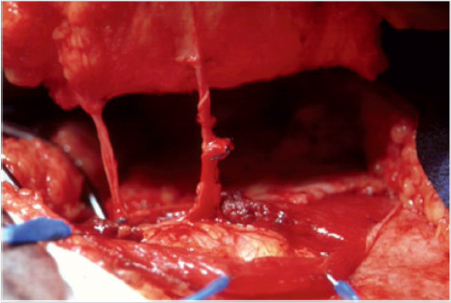 The skin and subcutaneous tissue are dissected off the fascia of the external oblique as far as the lateral margin of the rectus abdominis. After this the dissection must be performed with greater caution. Further dissection progressively exposes smaller vessels that arise from the perforator (▶Fig. 2.20). If preoperative color duplex sonography or CT angiography was performed, then the dissection can be quickly carried to the respective perforator. If not, then as many as possible of the lateral row of perforators should be exposed before selecting the largest or two larger ones. As a rule, larger gaps in the fascia are indicative of a larger perforator. If several perforators appear suitable then their size will be the decisive criterion. The largest perforator should be selected in each case. The vessels should be at least about 1.5 mm in diameter. Also note whether there are two or more perforators in a row arising from a common trunk of the inferior epigastric artery. Exposing two perforators has an advantage: A bilateral vulvar defect can then be covered by dividing the flap in the middle, with each half receiving its blood supply from one perforator.
