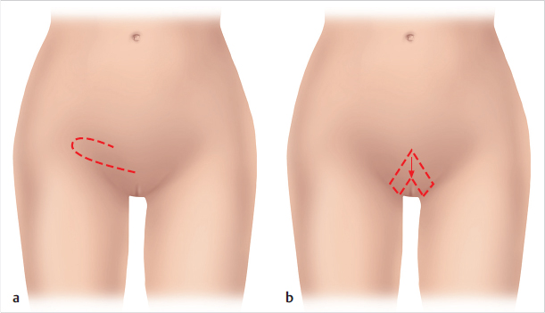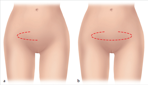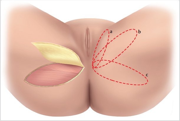 The longitudinal axes of the various possible flaps extend from here along the outer margin of the labia majora (inner lotus petal flap or pudendal thigh flap), the gluteal fold (lower lotus petal flap or gluteal fold flap), which should be drawn on the standing patient preoperatively (▶Fig. 2.27), or in the area between them (intermediate lotus petal flap).